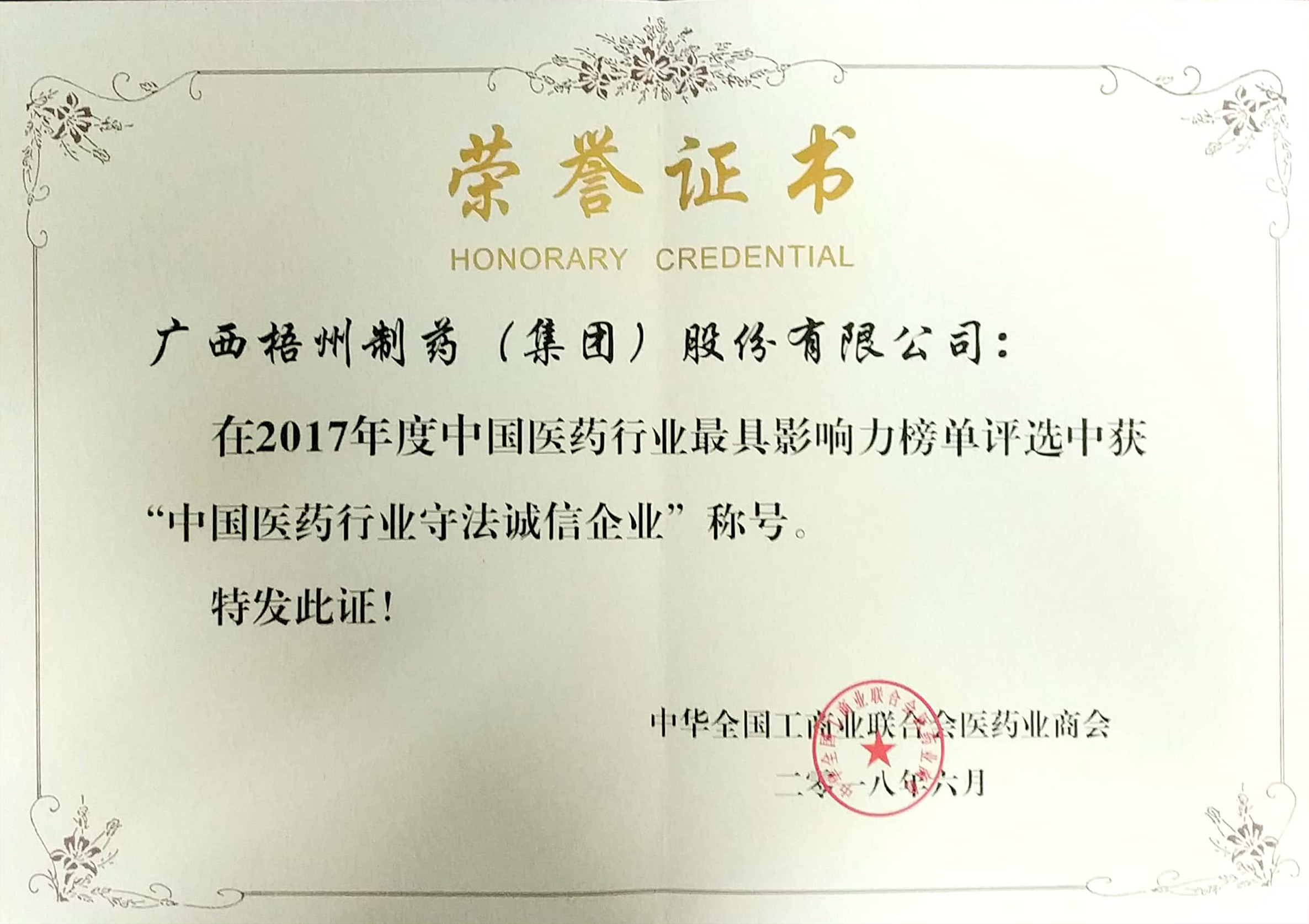 荣获2017年度中国医药行业守法诚信企业称号