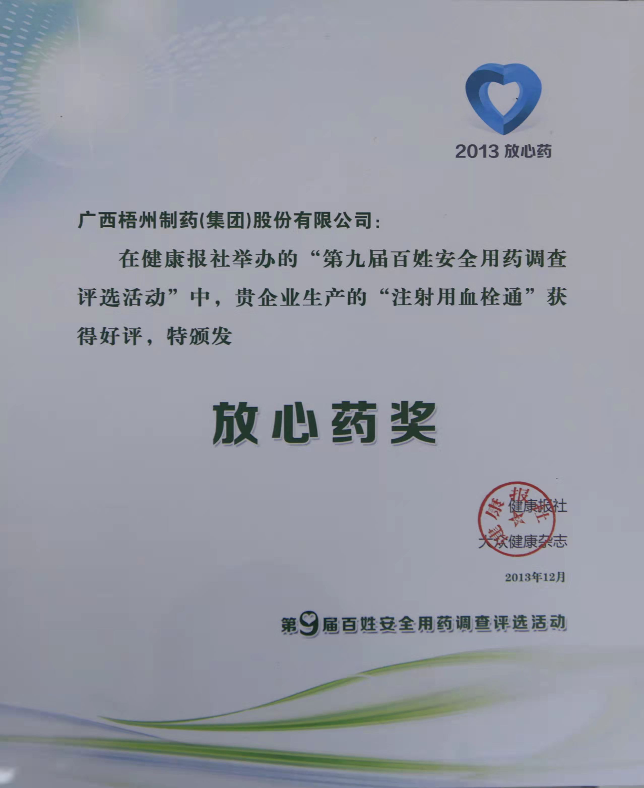 荣获第九届百姓安全用药调查评选活动“放心药”奖
