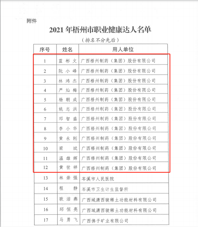 近日,梧州市卫生健康委公布2021年度梧州市职业健康达人评选结果,sunbet申搏12名职工获得“职业健康达人”称号。