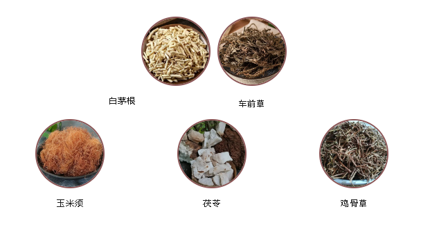 臣药:白茅根、车前草、玉米须、茯苓、鸡骨草
