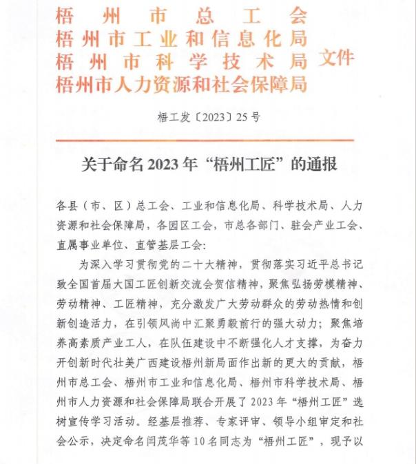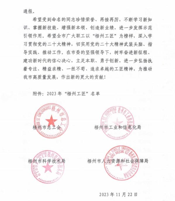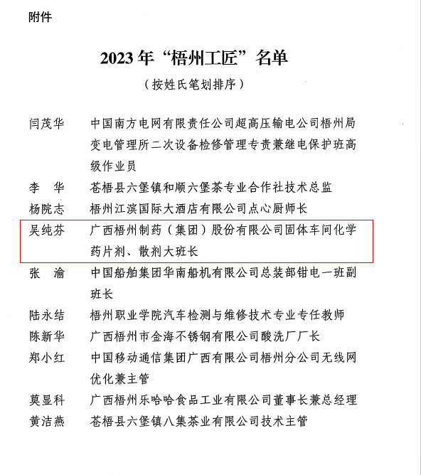 近日,梧州市总工会、梧州市工业和信息化局、梧州市科学技术局、梧州市人力资源和社会保障局联合发布《关于命名2023年“梧州工匠”的通报》,梧州市有10名同志被选树为“梧州工匠”,其中,sunbet申搏固体车间化吴纯芬获此殊荣。