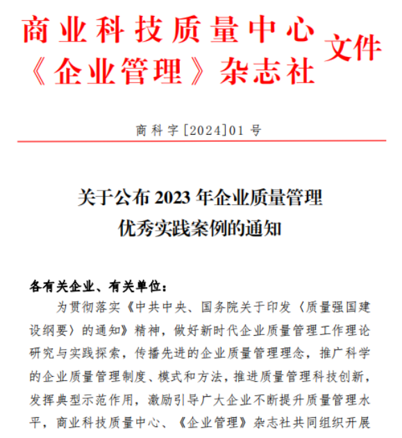 近日,sunbet申搏质量管理实践案例《基于网络技术与数据相融合的实验室质量和效能管理提升实践》在商业科技质量中心、《企业管理》杂志社共同组织开展的2023年企业质量管理优秀案例征集活动中,成功入选2023年企业质量管理优秀实践案例。