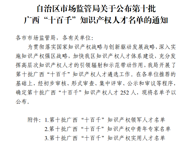 近日,自治区市场监管局公布第十批广西“十百千”知识产权人才名单,sunbet申搏副董事长、总经理刘洋同志获“A3企业知识领军人才”称号,药学事务部知识产权专员蒙永明同志获“B3 企业知识产权中青年专家”称号。